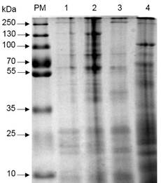 La electroforesis se realizó en dos fases, la de compactación a 40 V y 100 A durante 1 h y la fase de separación se llevó a cabo a 90 V y 100 A durante 3 h. Posteriormente el gel fue teñido con una solución de colorante azul de Coomassie G-250 al 0.1% durante 1 h y se destiñó en metanol/ácido acético. Se estimó el peso molecular de las bandas de proteínas presentes en cada muestra según el marcador de peso molecular utilizado. Los perfiles de proteínas observados fueron comparados con el perfil de la cepa de referencia B. thuringiensis subsp. kurstaki HD1.