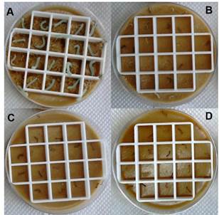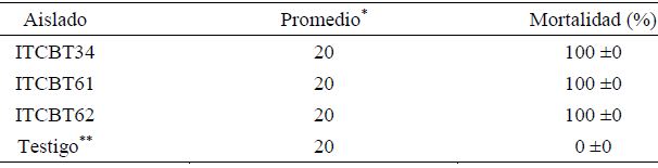 La prueba de actividad insecticida se realizó con una concentración de 10 µg cm-2, los tres aislados presentaron actividad insecticida contra larvas de Manduca sexta. A las 96 h se observó 100% de mortalidad de larvas (Cuadro 3). Las larvas expuestas a los aislados presentaron síntomas de necrosamiento general y licuado interno, características típicas de la toxicidad causado por las proteínas Cry de B. thuringiensis (Silva et al., 2010) (Figura 4).