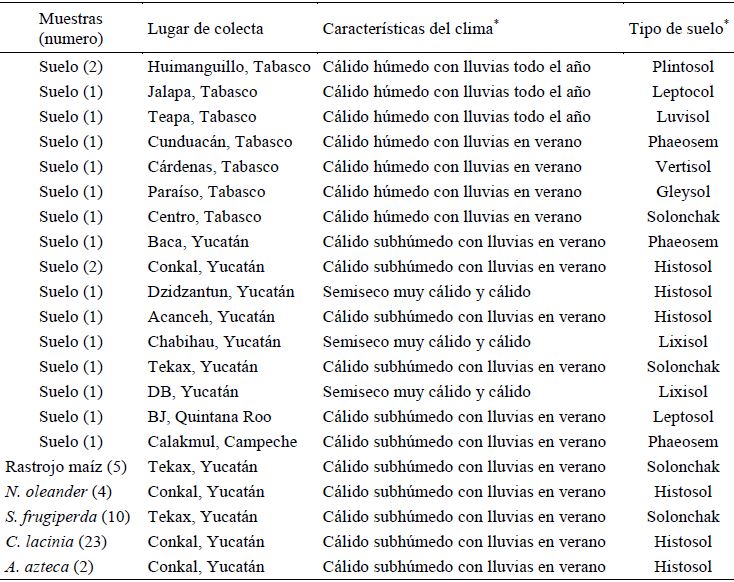 Se procesaron muestras obtenidas de suelo, larvas de Spodoptera frugiperda J. E. Smith (Lepidóptera: Noctuidae), larvas de Chlosyne lacinia ssp. lacinia Geyer (Lepidóptera: Nymphalidae), adultos de Aidemona azteca Saussure (Ortóptera: Acrididae), hojas de Nerium oleander L. y rastrojo de Zea mays L. Estos materiales fueron obtenidos de diferentes regiones del sureste mexicano, las muestras de suelo fueron colectadas ocho en el estado de Tabasco, ocho en Yucatán, una en Campeche y una en Quintana Roo. Respecto a los demás materiales, se obtuvieron 23 muestras de larvas de C. lacinia, dos muestras de adultos de A. azteca y cuatro muestras de hojas de N. oleander en el municipio de Conkal, seis muestras de larvas de S. frugiperda y cinco muestras de rastrojo de maíz en el municipio de Tekax, ambos en el estado de Yucatán (Cuadro 1). Para el aislamiento de bacterias a partir de suelo se pesaron 5 g de la muestra y se colocaron en un tubo Falcon de 15 mL, el cual fue aforado con agua destilada estéril hasta dicho volumen y la mezcla fue resuspendida mediante agitación vigorosa en Vortex durante 1 min. Se pasteurizó en baño María a 80 °C por 15 min y se enfrió inmediatamente en hielo.