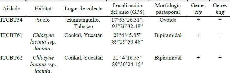 En el presente trabajo los aislados seleccionados que fueron confirmados como B. thuringiensis presentaron cristales ovales, muestra obtenida de suelo, y bipiramidales de muestras de larvas de Chlosyne lacinia (Cuadro 2). El índice de aislamiento de B. thuringiensis obtenido fue de 0.11. Este resultado se encuentra dentro de los valores reportados previamente, ya que es posible encontrar reportes con índices de 0.04 a 1 (Rosas-García et al., 2008; Alper et al., 2014).