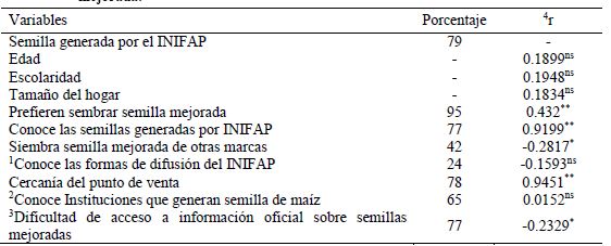 La mayor parte de los entrevistados siembran semillas de origen INIFAP (51%) o bien la siembran junto a otras marcas (27). El Cuadro 1 muestra las variables socioeconómicas asociadas a la decisión de sembrar la semilla mejorada.