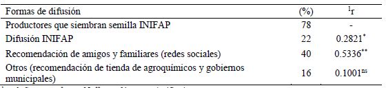 El impacto de los medios de difusión en la siembra de semilla mejorada, mostró que las formas de difusión del INIFAP no son las más importantes (22%) y participan las recomendaciones de tiendas de agroquímicos y los municipios (16%), pero las redes sociales (recomendación de amigos o familiares) fueron el medio más importante en porcentaje (40%) y estadísticamente más importante (Cuadro 2).
