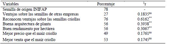 De acuerdo con esto, gran parte de los productores reconocen que la semilla INIFAP, tiene ventajas sobre los maíces criollos, manifestando buena correlación con la decisión de siembra, mientras que, buena arquitectura de planta y buen rendimiento por hectárea, aunque son variables perceptuales y provienen de la observación empírica de los encuestados, sobresalen como variables técnicas con asociación mediana. El buen rendimiento, es una característica especial de las semillas INIFAP, rasgo que hace rentable la producción de semilla y grano, también importante para Kalinda et al. (2014) en la adopción de variedades mejoradas de semillas de maíz en Zambia, pues favorecen las expectativas sobre los ingresos.
