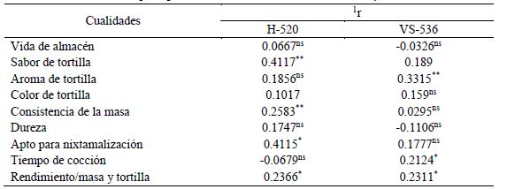 El H-520 es utilizado por el buen sabor de la tortilla y su aptitud para nixtamalización, con coeficientes de mediano valor, la buena consistencia de masa y rendimiento/masa y tortilla, obtuvieron asociaciones débiles. El material VS-536 está asociado a buen aroma de tortilla, tiempo de cocción y rendimiento/masa y tortilla, todas las variables con coeficientes de correlación bajos. Los datos señalan que los productores diferencian la semilla y priorizan la importancia del autoconsumo, con percepciones de orden culinario. Al respecto, Lunduka et al. (2012) encontraron que los atributos específicos de las diferentes variedades de maíz en Malawi son una influencia importante en su uso y las variedades locales de maíz son populares por una serie de características favorables para el procesamiento, consumo, almacenamiento, la proporción de harina lograda, y el sabor. En Sudáfrica, las características del maíz preferido por los agricultores, son las variedades criollas, debido a su sabor, la posibilidad de guardar semilla para sembrar y el rendimiento (Sibiya et al., 2013).