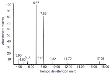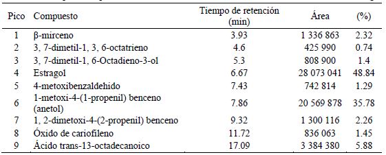 En cuanto a la identificación de compuestos se determinaron nueve, separados en tiempos de retención de 3.9 a 17 min los cuales se presentaron en la secuencia siguiente: β-mirceno (3.93 min), 3,7-dimetil-1,3,6-octatrieno (4.60 min), 3,7-dimetil-1,6-octadieno-3-ol (5.30 min), estragol (6.67 min), 4-metoxibenzaldehído (7.43 min), 1-metoxi-4-(1-propenil) benceno (7.86 min), 1, 2-dimetoxi-4-(2-propenil) benceno (9.32 min), óxido de cariofileno (11.72 min) y ácido trans-13-octadecanoico (17.09) (Cuadro 2, Figura 3).
