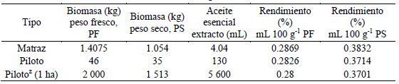 Para realizar la extracción (repetición) a nivel laboratorio, se utilizó 1.5 kg de material vegetal fresco para una destilación realizando cuatro repeticiones, el periodo de la destilación fue de 45 min. Para la extracción a nivel piloto se utilizaron 46 kg de material fresco, el tiempo de hidrodestilación fue de 3 h a partir de la precipitación. Del destilado se obtuvieron dos fases (acuosa y aceitosa), la parte aceitosa fue separada y conservada en frascos ámbar conservados en cuarto oscuro a temperatura de 18 ±2 °C. El rendimiento de aceite esencial se obtuvo referido en biomasa fresca.