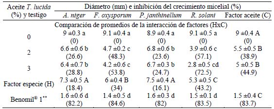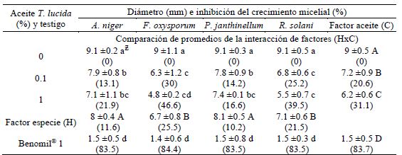 Considerando el efecto de interacción, se observó que 2 y 3% de aceite de T. lucida presenta menor diámetro y mayor porcentaje de reducción micelial en F. oxysporum (4.7-4.2 mm; 48 y 53%) y en R. solani (3.9-2.8 mm; 57 y 72%), con respecto del testigo absoluto (9.0-9.1 mm) y en comparación con A. niger (6.6-6.4 mm; 26-28%) y P. janthinellum (6.8-6.7; 23-24%) (Cuadro 4). Estos resultados coinciden parcialmente con lo reportado por Castellanos et al. (2011) quienes indican que el micelio de R. solani resulta inhibido por extractos metanólicos de T. lucida en dosis de 240 µg/mL. La poca inhibición de las especies A. niger y P. janthinellum se debe a su actividad esporulante, ya que los conidios pueden ser más resistentes ante algunos agentes antifúngicos (Barajas et al., 2011); por lo tanto, la actividad biológica del aceite de esta población de T. lucida en los ascomicetos estudiados no es promisoria, como se señaló anteriormente.