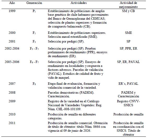 El desarrollo de la variedad partió de la colección de chile habanero del Banco de Germoplasma de Chile del Campo Experimental Las Huastecas (CEHUAS)-INIFAP, la cual contiene materiales originarios de las zonas productoras de Yucatán, Quintana Roo, Campeche y Veracruz, colectados en la década de los 80’s y principios de los 90’s. En una primera fase se evaluó la colección y en base a su adaptación se inició el proceso de selección.