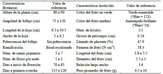 Produce frutos uniformes, de color verde esmeralda en estado verde sazón, que se tornan anaranjado brillante en madurez total (Figura 1), muy atractivos para mercado en ambos estados de madurez. Tiene frutos con longitud de 3.8 a 5.5 cm y 2.5 a 3 cm de diámetro, los cuales reúnen las características especificadas en la Norma Mexicana para Chiles Frescos (CTNNPAP, 2007). El peso de fruto es de 6.5 a 10 g y presenta muy buena firmeza (58.3 N cm-2) (Cuadro 2), lo que indica que tanto el pericarpio como las paredes internas del fruto presentan mayor solidez lo que le confiere resistencia al transporte y buena vida de anaquel (Ramírez et al., 2015).