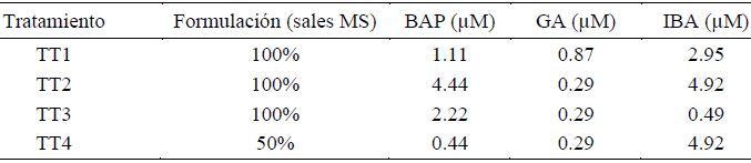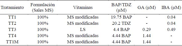 Los brotes apicales ya desinfectados fueron sembrados en cuatro diferentes formulaciones de medios de cultivo, tres de ellos con micro y macro elementos, adicionados con orgánicos según la formulación MS modificado (Cuadro 1) (Murashige y Skoog, 1962), suplementados con 1.11 µM de bencil-aminopurina (BAP), 0.87 µM ácido giberélico (GA) y 2.95 µM de ácido indolbutírico (IBA) para el primer tratamiento testigo (TT0); el primer tratamiento (TT1), fue suplementado con 4.44 µM de BAP, 0.29 µM GA y 4.92 µM de IBA; asimismo, el segundo tratamiento (TT2), con 2.22 µM BAP, 0.29 µM GA y 0.49 µM de IBA. Finalmente, otro medio de cultivo formulado con sales y vitaminas MS al 50%, suplementado con 0.44 µM BAP, 0.29 µM GA y 4.92 µM de IBA se identificó como el tercer tratamiento (TT3), utilizando los reguladores de crecimiento sugeridos por diversos autores quienes han reportado éxito en sus formulaciones (Boxus, 1974; de López, 2001; Beltrán, 2002; Caboniet et al., 2008) (Cuadro 1).