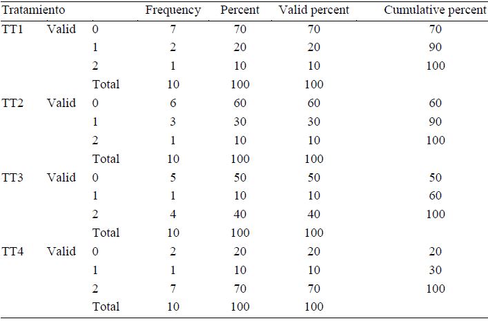 Estas variables se analizaron mediante las pruebas no paramétricas de Kruskal-Wallis debido al pequeño numero de repeticiones por tratamiento con el cual no es valida de chi2 para prueba de proporciones, se aplicó la prueba de Dunn, para la separación de medias Neave y Worthington (1988), utilizando el paquete estadístico Minitab® versión 17.1.0.