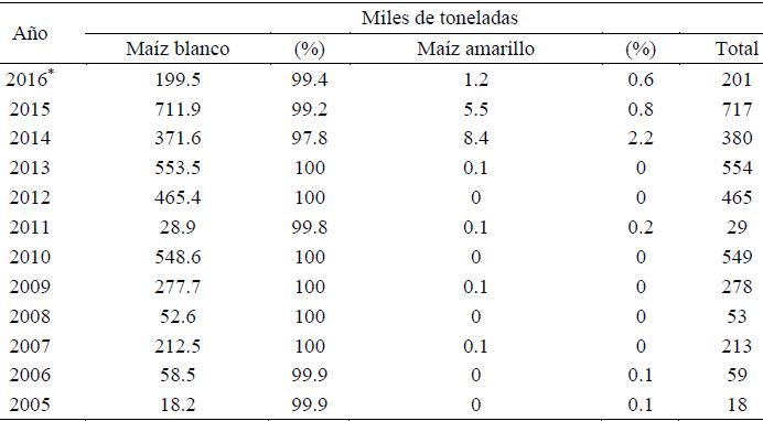 Con relación a las exportaciones, México en el periodo 2005-2016 exportó 3.5 millones de toneladas de maíz, de las cuales 99.6% fueron de MB destinadas principalmente a Venezuela, El Salvador, Estados Unidos de América, Colombia y Sudáfrica; mientras que 0.4% fueron de MA consignadas a Estados Unidos de América, Canadá, Cuba, Reino Unido y Dinamarca. (Cuadro 1).