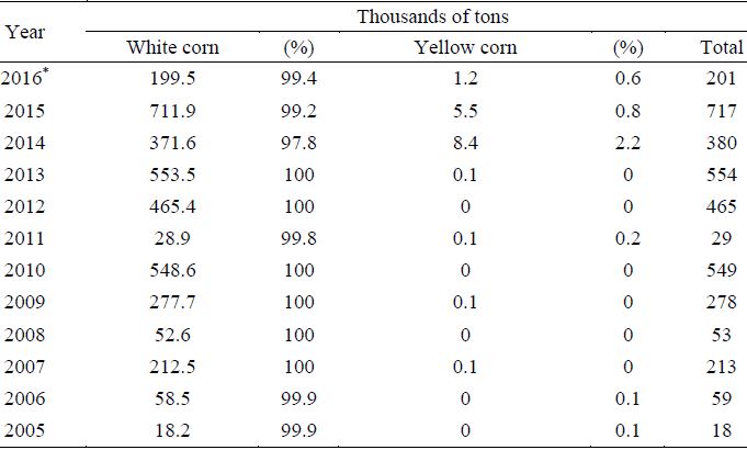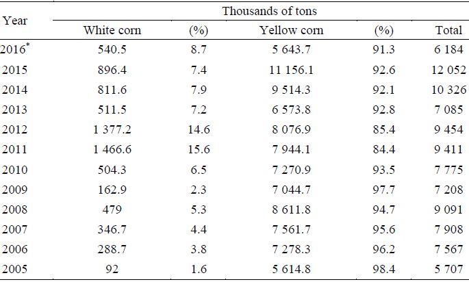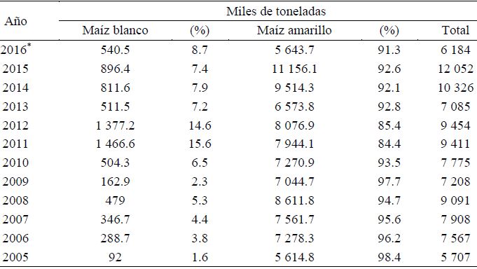 Por otra parte, las importaciones para el mismo periodo fueron de 99.7 millones de toneladas de maíz, de las cuales 92.5% corresponden a MA provenientes de Estados Unidos, Brasil, Argentina, Canadá y Belice, mientras que 7.5% corresponden a MB originarios de Estados Unidos de América, Mozambique y Sudáfrica, ratificando que México es un importador neto de MA (Cuadro 2).