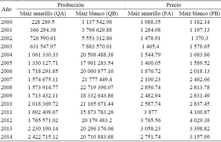 El Cuadro 3 muestra la información obtenida del SIAP referente a precios y cantidades de maíz por variedad, el precio del maíz amarillo es en promedio aproximadamente 7% menor al precio del maíz blanco; asimismo, la cantidad de maíz blanco es en promedio 85% de la producción total para ambas variedades. Lo que sustenta que el mercado de maíz en México es dominado por el maíz blanco.