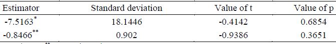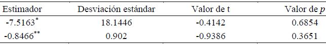 Para el primer caso, la estimación directa de la elasticidad de sustitución estimada se obtuvo un valor puntual de -7.5163, con una desviación estimada de 18.1446 y una estadística t de -0.4142 para el juego de hipótesis referido. Para el segundo caso, la estimación mínimo cuadrática el estimador de la elasticidad de sustitución resulto en -0.8466 con una desviación estándar de 0.9020, resultando para el juego de hipótesis una estadística de t de -0.9386.