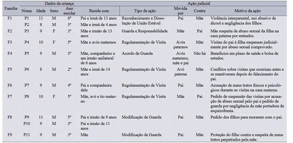 O critério para a seleção dos casos foi a dinâmica familiar que evidenciou intenso conflito, crônico ou não, principalmente, entre o par parental (Johnston, Roseby, & Kuehnle, 2009). Os participantes foram 11 crianças pertencentes a nove famílias que fizeram parte do estudo psicossocial, com idades que variaram entre 8 e 11 anos, conforme descrição na Tabela 1.