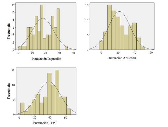 Como se muestra en la tabla 1, las puntuaciones de los adolescentes con antecedentes de abuso sexual en las escalas de depresión, ansiedad y TEPT presentan un amplio rango de variación, acercándose a los puntajes mínimos y máximos permitidos por cada escala. Asimismo, los análisis con la prueba de Kolmogorov Smirnov indican que las puntuaciones de los tres tipos de sintomatología se distribuyen normalmente entre estos adolescentes (p > ,05 en todos los casos). La figura 1 muestra la distribución de las puntuaciones de las tres variables.