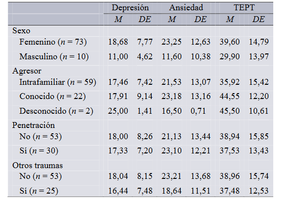 Por otro lado, los resultados muestran que los adolescentes que han sufrido abusos sexuales con penetración presentan niveles de sintomatología similares a los que han sufrido abusos sin penetración (t(81) = 0,369; p ,05 en el caso de depresión, t(81) = -0,665; p ,05 en el caso de ansiedad y t(81) = 0,411; p ,05 en el caso de TEPT). La sintomatología tampoco es diferente en el caso de aquellos donde, además del abuso sexual, existen antecedentes de otras situaciones traumáticas diferentes al ASIA, en comparación con los que no habrían sufrido otro tipo de traumas (t(76) = 0,829; p ,05 en el caso de depresión, t(76) = 1,444; p ,05 en el caso de ansiedad y t(76) = 0,413; p ,05 en el caso de TEPT).