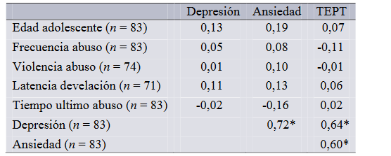 Por último, la tabla 3 muestra que la edad de los adolescentes, la frecuencia del abuso sexual, el nivel de violencia utilizado por el agresor sexual, la latencia de la develación y el tiempo transcurrido desde el último episodio de abuso no se relacionan con ninguna de las tres medidas de sintomatología evaluadas (relaciones rho de Spearman no significativas en todos los casos, ps > ,05).