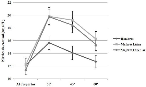 Así mismo, se encontró un efecto principal del grupo, F(2,127) = 3,28; p = ,05; ?2 parcial = ,05, mostrando las mujeres en fase lútea una mayor CAR que los hombres (p = ,05). Además, se encontró un efecto de la interacción momento*grupo en el momento 3 (45), F(3,720, 236,226) = 2,93; p = ,05; ?2 parcial = ,04, mostrando las mujeres (en fase lútea y fase folicular) mayores niveles de cortisol que los hombres (ps = ,05). En la Figura 1 se observan estas diferencias.