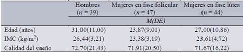Se hallaron diferencias significativas entre grupos en las variables edad e IMC, F(2, 127) = 5,13; MSE = 105,52; p = ,05, ?2 parcial = ,08, y F(2, 127) = 8,35; MSE = 14,32; p = ,05; ?2 parcial = ,12, respectivamente (Tabla 1). Los hombres fueron mayores que las mujeres en fase folicular (p = ,05), pero no mayores que las mujeres en fase lútea (p = ,24). Tampoco se obtuvieron diferencias estadísticamente significativas en edad entre los dos grupos de mujeres (p = ,45). Por otro lado, los hombres presentaron un IMC superior al de las mujeres, tanto en fase folicular (p = ,05) como lútea (p = ,05); mientras que no se observaron diferencias estadísticamente significativas entre ambos grupos de mujeres (p = 1,00). En cuanto a calidad de sueño, no hubo diferencias estadísticamente significativas entre los grupos, F(2, 123) = 0,03; p = ,97. Dados estos resultados, el efecto de las variables edad e IMC se controló en los posteriores análisis, añadiéndolas como covariables en los análisis posteriores.