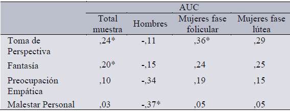 Al analizar a los hombres, el AUC correlacionó negativamente con la subescala MP (Tabla 2), de modo que aquellos con un AUC mayor tienden a experimentar un menor malestar personal. En las mujeres en fase folicular (Tabla 2), se halló una correlación positiva entre el AUC y la subescala TP. En el caso de las mujeres en fase lútea no se hallaron correlaciones significativas entre el AUC y las subescalas de empatía.