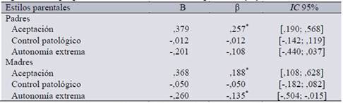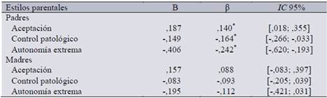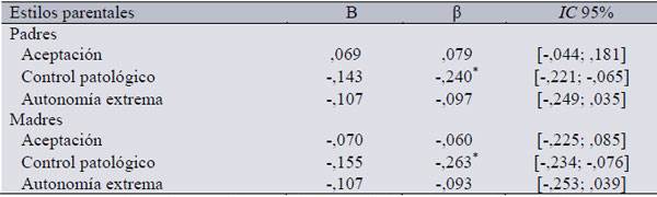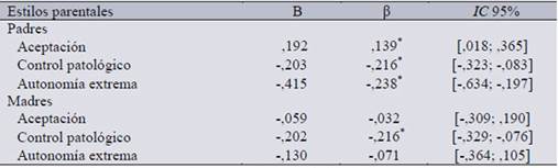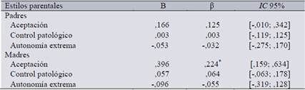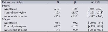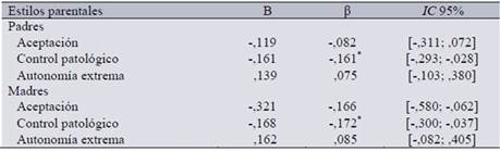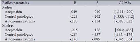 En el caso de la madre, se encontró una variable que predijo leve, pero significativamente, la concentración: R2= ,044; F(3, 225) = 3,553; p = ,015. A mayor control patológico, menor es la concentración y focalización que logra el hijo al estudiar (β = -,216; p = ,002).