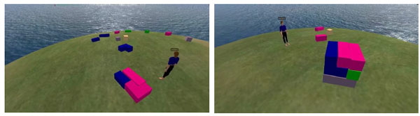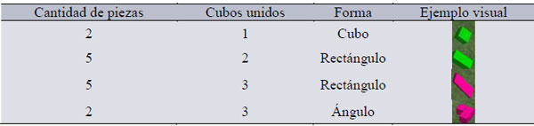 El entorno virtual colaborativo consistió en una "isla" en la que se pusieron desordenadamente 14 piezas; formadas, cada una de ellas, con distintas cantidades de cubos (ver Tabla 2) de diferentes colores, que los participantes, agrupados en díadas, tenían que utilizar para formar una figura geométrica (ver Figura 1).