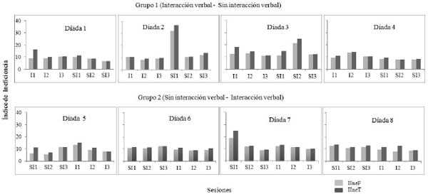 En lo que respecta al Grupo 2, tres de las díadas (la 6 en SI3, la tercera sesión sin interacción verbal, y las Díadas 7 y 8 en SI1) mostraron los mayores índices de ineficiencia (IIneF e IIneT) durante la Fase 1 en la que se restringió la comunicación entre los participantes.