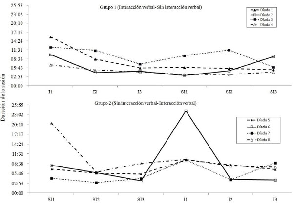 Por otra parte, el que la mitad de las díadas (las díadas del Grupo 1) haya alcanzado una mayor duración en la resolución de la tarea durante SI1 (sesión con posibilidad de comunicación), pudo deberse a que esta fue la primera sesión del experimento y, probablemente por ello, a un proceso de aprendizaje sobre el funcionamiento de la tarea. Este efecto, aunque no fue tan marcado en el Grupo 2 (que inició con restricción verbal), también se presentó.