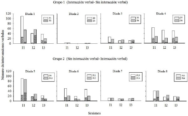 Con excepción de la Díada 2 (Grupo 1), cuyas intervenciones verbales fueron prácticamente nulas, todas las díadas se comunicaron entre ellas cuando tuvieron la oportunidad de hacerlo. En la mayoría de las sesiones se presentaron comentarios directivos o estratégicos por parte de los dos participantes (excepto en SI2 de la Díada 6 y en SI3 de la Díada 8, en la que uno de los participantes no realizó este tipo de comentarios).