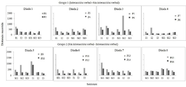 Finalmente, se presentó el número de interacciones verbales (totales y directivas o estratégicas) establecidas entre los participantes, así como los datos por participante, de la distancia recorrida por los objetos y del número de movimientos realizados a lo largo de las sesiones (a diferencia de los índices de ineficiencia en los que se presentó el dato por díada).