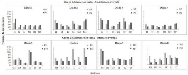 Por último, la Figura 7 muestra los datos, por participante, del número de movimientos realizados a lo largo de las sesiones. Se puede observar también que en todas las díadas uno de ellos (2, 3, 6, 11, 13 y 15) movió más objetos que el otro en la mayoría de las sesiones (con excepción de las Díadas 4 y 5, en las que un participante movió más objetos en tres sesiones y el otro participante en las otras tres).