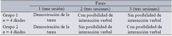 En el Grupo 2 se invirtió el orden de las condiciones, durante la primera fase no se permitió la interacción verbal entre los participantes de las díadas, mientras que en la segunda fase experimental los participantes pudieron interactuar verbalmente entre ellos. La Tabla 1 presenta el diseño experimental utilizado.