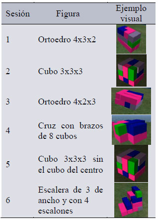 Los participantes tuvieron que armar seis figuras distintas, una para cada sesión experimental, con el objetivo de evitar un efecto de aprendizaje (ver Tabla 3). Al inicio de cada sesión experimental, se mostró a los participantes la figura que tenían que armar en un modelo hecho con piezas de plástico (ver Figura 2). Dicha figura permaneció a la vista de los participantes durante toda la sesión experimental.
