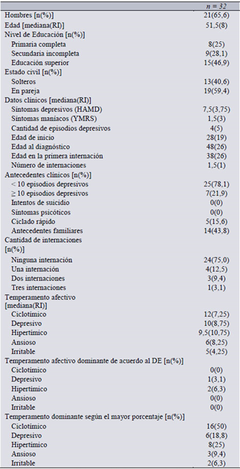 Un total de 32 individuos adultos, eutímicos, con diagnóstico de TB II participaron del estudio. Todos los participantes fue-ron reclutados de una clínica privada de la ciudad de Buenos Aires y cumplían con los criterios de un trastorno bipolar tipo II, de acuerdo a la quinta edición del Manual Diagnóstico y Estadístico de los Trastornos Mentales (DSM, por su nombre en inglés Diagnostic and Statistical Manual of Mental Disorders; American Psychiatric Association, 2013).