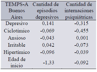 Por otro lado, cabe remarcar que los coeficientes de correlación relativos a los temperamentos ciclotímico y depresivo, junto a la cantidad de internaciones psiquiátricas, obtuvieron valores moderados, si bien no significativos.