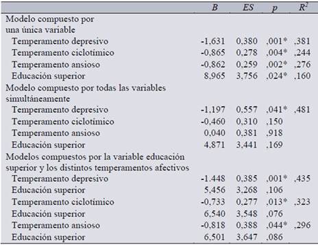 Como parte de un análisis secundario de tipo post hoc, fueron efectuadas regresiones lineales multivariadas, ajustando la edad de inicio de acuerdo a aquellas variables que hubieran mostrado previamente una relación lineal significativa. Así, se ensayaron distintos modelos, incluyendo: los cuatro temperamentos afectivos (exceptuando el hipertímico), el TAD hipertímico y ciclotímico, y la variable nivel de instrucción superior (transformada en una variable indicadora de presencia o ausencia para poder ser incluida en el análisis). Esta última variable también presentó una asociación significativa, positiva y moderada con la edad de inicio (ρ = 0,425; p = ,015). Las restantes variables temperamentales, sociodemográficas (sexo y estado civil) y clínicas (puntajes en las escalas YMRS y HAMD, cantidad de internaciones y de episodios depresivos) no fueron incluidas, al no haber resultado significativas en los análisis de correlación bivariada.