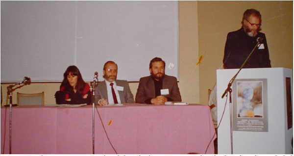 De izquierda a derecha: General Alejandro Medina, interventor militar en la Universidad de Chile; Jaime del Valle, Vicerrector Académico de la Pontificia Universidad Católica de Chile; Jacinta Scagliotti y Gloria Jaramillo, Consejeras del Colegio de Psicólogos de Chile. Fotografía del Archivo del Colegio de Psicólogos de Chile.