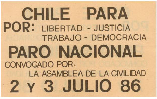 La Asamblea organizó el gran paro nacional del 2 y 3 de julio de 1986, provocando la paralización del país; la primera, real, pero insuficiente, desestabilización de la Dictadura. Pocos días después, se produjo la detención de la plana mayor de la Asamblea de la Civilidad. La Presidenta del Colegio, Soledad Larraín, estuvo presa durante 10 días por el llamado al paro nacional.