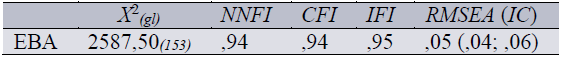 Para realizar el análisis estadístico de los datos se utilizaron los programas SPSS 22 y EQS 6.1. En primer lugar, se analizó la confiabilidad de EBA a partir del análisis de consistencia interna, empleando el estadístico alfa ordinal. En segundo lugar, la validez de constructo fue evaluada empleando un análisis factorial confirmatorio (AFC). Por otro lado, dado que las variables observables no presentan un nivel de medición continuo, se decidió utilizar el método mínimos cuadrados generalizados arbitraria (AGLS, por su nombre en inglés Arbitrary Generalized Least Squares), siguiendo recomendaciones previas en la literatura especializada (Schermelleh-Engel, Moosbrugger, & Müller, 2003).