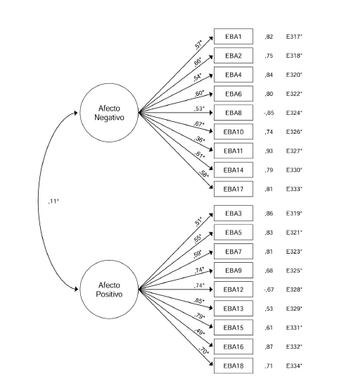 La EBA (Warr et al., 1983) ha demostrado propiedades adecuadas para ser administrada en el contexto local. La misma presenta 18 ítems similares a los originales propuestos por sus creadores (ver anexo). A partir de la aplicación del AFC se ha podido comprobar que el modelo bifactorial de la EBA ha presentado un ajuste adecuado a los datos obtenidos en la población estudiada, de manera similar a lo que se ha reportado en otros contextos (Godoy-Izquierdo, Martínez, & Godoy, 2008). Si bien el valor inferior a ,50 de la covarianza entre las dos variables latentes (afecto positivo-afecto negativo) podría ser considerada como evidencia de validez discriminante, llevando a contemplar la posibilidad de incluir una nueva variable latente e hipotetizar un modelo trifactorial (Lévy-Mangin & Varela, 2006), es necesario considerar que modelos de más de dos factores no cuentan con suficiente apoyo teórico que pueda ofrecer un marco explicativo para estos hallazgos empíricos.