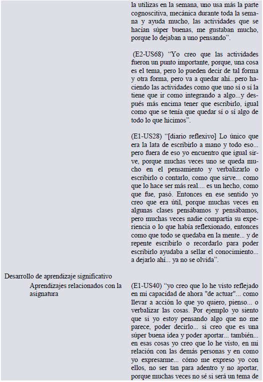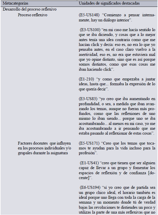 Cabe destacar que la verbalización de opiniones permite visualizar el avance de los tres procesos (reflexivo, trabajo grupal y aprendizaje significativo), pues la construcción de ideas mediante la reflexión, el reconocimiento y apropiación de aprendizajes significativos, permiten al estudiante percibir autoconfianza. Sumado a la percepción de un clima de confianza grupal, facilita la expresión verbal de ideas y opiniones, que a su vez motiva o estimula la expresión verbal en otros miembros del grupo. Además, es posible plantear que en esta dinámica se experimenta reflexión sobre la reflexión sobre la acción (Brockbank & Mcgill, 2002).