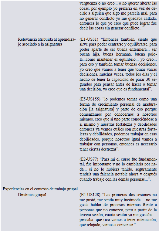 Las estudiantes desarrollan aprendizajes significativos, describiéndolos como un proceso dinámico en el cual identifican el aprendizaje inicial, lo aplican en distintos contextos, lo integran como propio y plantean una transferencia de este a nivel personal y profesional futuro. Conceden a la asignatura una connotación positiva, al haber facilitado tales procesos.