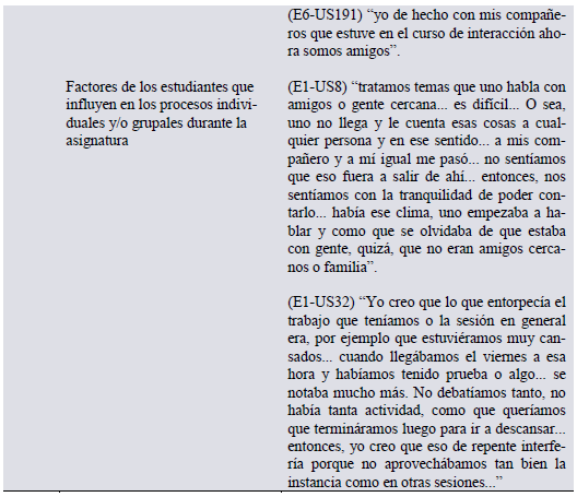 Respecto a los factores docentes que influyen en los procesos individuales y/o grupales durante la asignatura, existieron temas abordados en las sesiones que fueron más significativos que otros, pues los vincularon a situaciones personales y/o intereses actuales de la formación profesional.