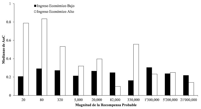 Como se puede ver en la figura 2, los participantes de ingreso alto mostraron un ABC más grande en todas las magnitudes de la recompensa demorada que los participantes de ingreso bajo. En ambos niveles de ingreso económico, el ABC aumentó conforme incrementó la magnitud de la recompensa demorada.