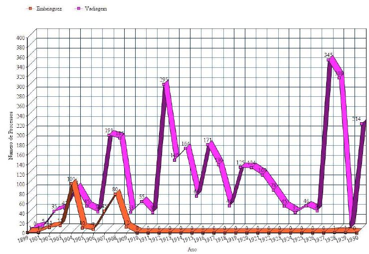 Os bêbados e as bêbadas, na Primeira República, eram mais problemáticos quando, também, vagabundos. Ainda segundo os gráficos do apêndice, percebe-se que nas diferentes freguesias a distribuição de processos por embriaguez e vadiagem obedecem a um mesmo padrão, de aumento e de diminuição até desaparecerem os casos de embriaguez no final da primeira década do século XX. Este dado corrobora a ideia de uma aproximação das duas tipificações e deixa bastante evidente que a atuação jurídica e policial da época aproximavam a percepção de embriaguez e vadiagem, pertencendo os dois tipos penais ao mesmo espectro de visibilidades, uma espécie de justaposição. Consideramos justaposição esta relação de proximidade de taxonomias, onde um mesmo indivíduo ou diferentes grupos transitam de uma a outra, porém mantendo-se as distinções práticas entre elas, ou seja, um bêbado tem regimes de discurso e práticas de internação diferentes do vagabundo. Para apontar essa proximidade taxonômica, podemos recorrer ao chefe de polícia em 1904, onde afirma que: “o bebedo habitual é, ipso facto, um vadio que deixa de exercitar profissão, officio ou qualquer mister em que ganhe a vida” (Ministério da Justiça e Negocios Interiores, 1904, p. 53).