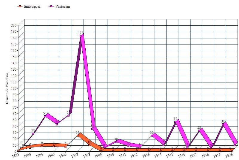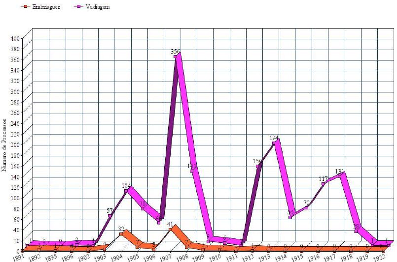 Até 1907, a relação entre vadios e ébrios se dava por justaposição, aproximando as visibilidades com a combinação dos artigos 396 e 399 nos processos crimes, através das defesas dos acusados clamando-se “não vagabundo” ou nas sentenças dos juízes afirmando não ser o ébrio vagabundo. O que se opera a partir daí é uma total incorporação do ébrio ao vadio. Dos 70 processos crimes de vadiagem analisados no período de 1912 a 1920, cerca de um terço (21) fazem alguma menção ao uso de bebidas alcóolicas sob a fórmula de uma presença constante do vagabundo em botequins ou embriagando-se, conforme pode ser observado a seguir: