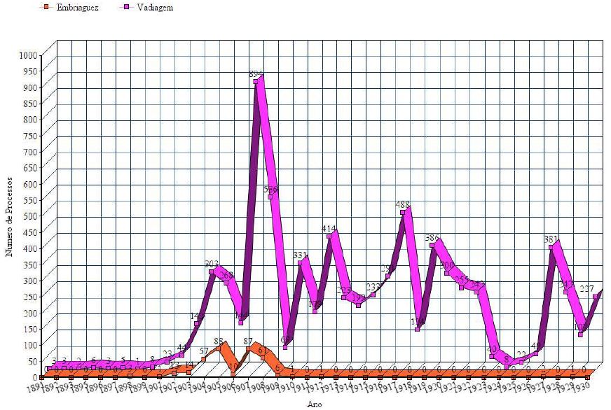 Após contabilizados os processos-crime, alguns foram selecionados para analisar como eram produzidos estes documentos. Foram analisados ao todo 156 processos-crimes em sua íntegra. Destes, 69 eram somente de vadiagem e os restantes, 78, de embriaguez ou embriaguez e vadiagem. Os processos foram selecionados aleatoriamente ao longo dos anos de 1889 até 1920, concentrando-se a maior parte dos processos de embriaguez em 1904, 1907 e o período pós pico de 1907 quando inicia um declínio de processos por embriaguez até seu cessar completo: entre 1908 e 19123. Todos os processos de embriaguez entre 1908 e 1912 foram analisados. O ano de 1912, portanto, foi utilizado como marco de análise pelo fato de que os últimos dois processos de embriaguez acontecem exatamente neste ano. Quanto aos processos de vadiagem, foram analisados aleatoriamente diversos processos de diferentes anos e pretorias após 1912. Assim, foram selecionados cinco processos de vadiagem por ano, independente da pretoria. Todo o processo metodológico descrito obedeceu a uma lógica interna própria às fontes documentais e a investigação seguiu os caminhos que desabrochavam de cada análise. Ou seja, a pesquisa foi encontrando seu objeto e método no próprio ato de pesquisar.