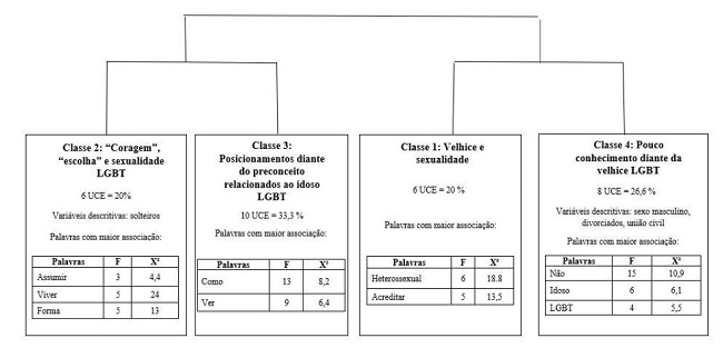 Quanto a CHD se obteve RS acerca da ve-lhice LGBT, em que o corpus textual de divi-diu em quatro classes. O corpus textual se constituiu por 47 unidades de contexto inicial, que se tornou 42 unidades de contexto ele-mentar (UCE). Foram classificados 38 para compor o corpus textual, tendo signifi¬cância de 72%, totalizando 859 ocorrências de pala-vras e a média por UCE foi de 28,52%. Quan-to ao Dendograma ( figura 1 ), os vocábulos escolhidos transcorreram o valor do qui-qua-drado de ≥ 4.13.